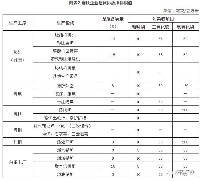 (一)有組織排放控制指標(biāo)。燒結(jié)機(jī)機(jī)頭、球團(tuán)焙燒煙氣顆粒物、二氧化硫、氮氧化物排放濃度小時(shí)均值分別不高于10、35、50毫克/立方米;其他主要污染源顆粒物、二氧化硫、氮氧化物排放濃度小時(shí)均值原則上分別不高于10、50、200毫克/立方米,具體指標(biāo)限值見附表2。達(dá)到超低排放的鋼鐵企業(yè)每月至少95%以上時(shí)段小時(shí)均值排放濃度滿足上述要求。